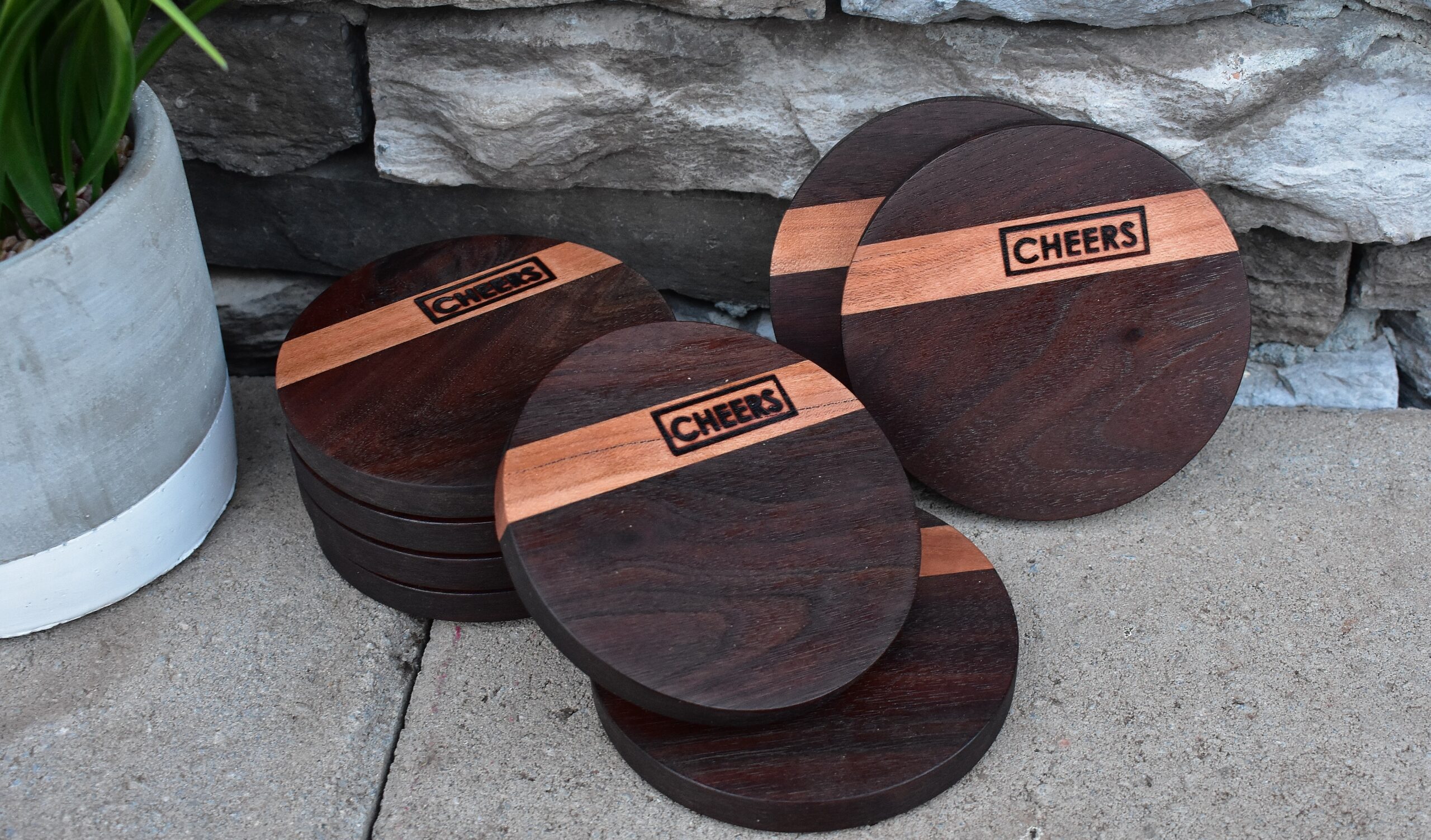 Walnut with a cherry accent. Rounded by hand then burned with our ‘Cheers’ series logo. Finished with a cork underside.