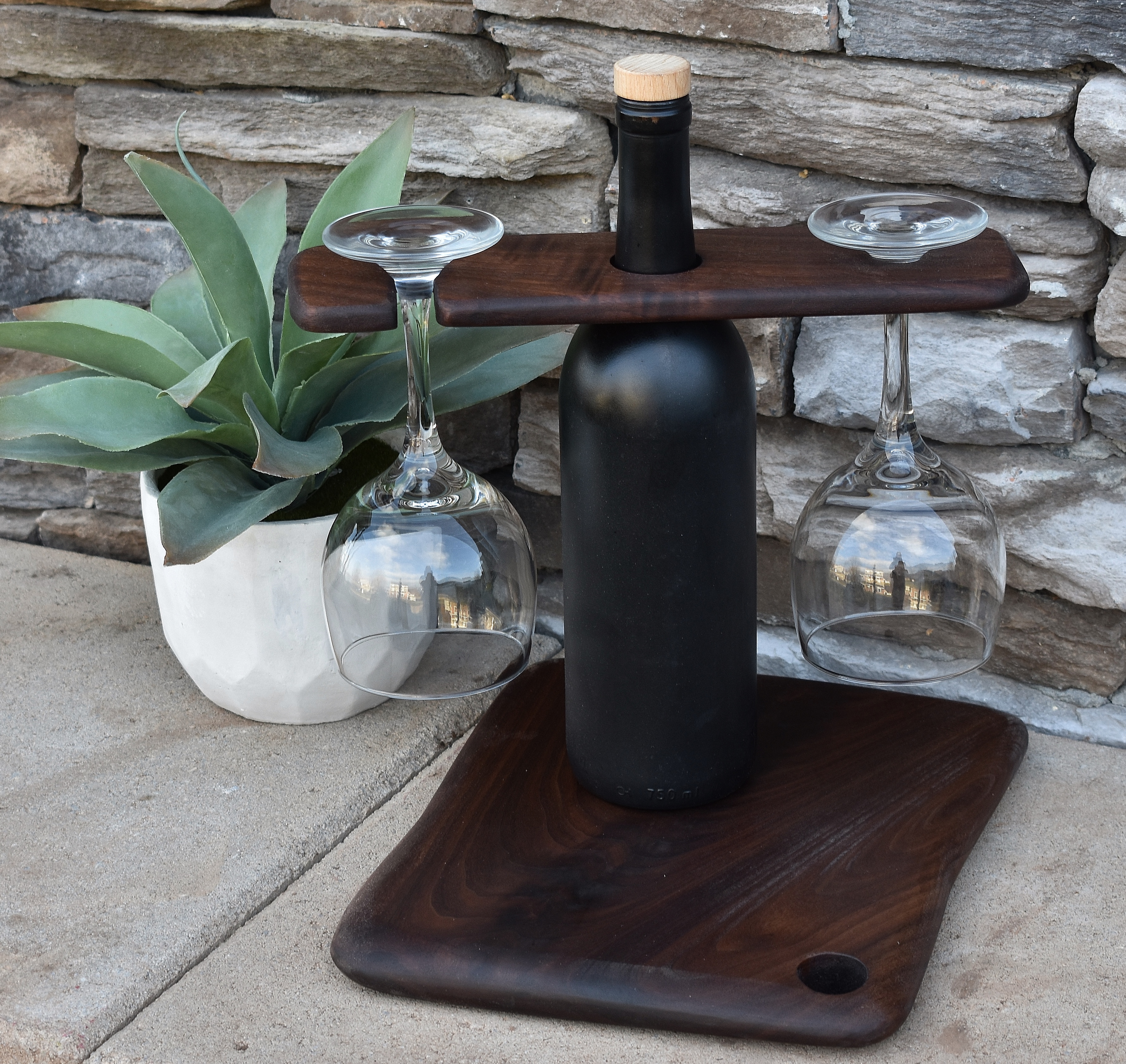 A two piece set of rich walnut character. The first, a display piece to hold your stemware. The second, a cheese board to compliment your taste in wine!